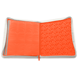 • Features iconic Lotus symbol debossed on white leatherette material with orange stitching and matching orange patterned interior