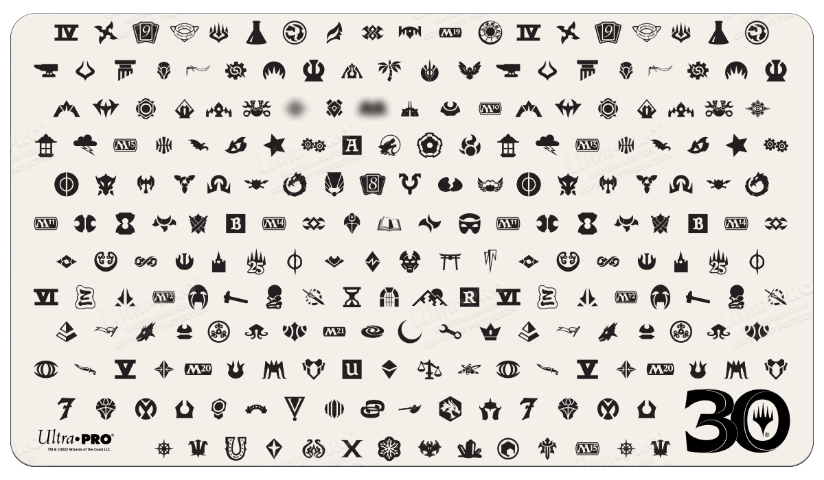 Holofoil Playmats (patent pending) feature popular Magic: The Gathering expansion symbols from the past 30 years of the trading card game on a shiny holofoil printed material. Made with a soft fabric top to reduce damage to cards during play and a non-slip rubber backing to keep the playmat from shifting during use, playmats enhance the gameplay experience. With dimensions of approximately 24 in. x 13.5 in., a playmat also makes an excellent oversize mousepad for home or office.