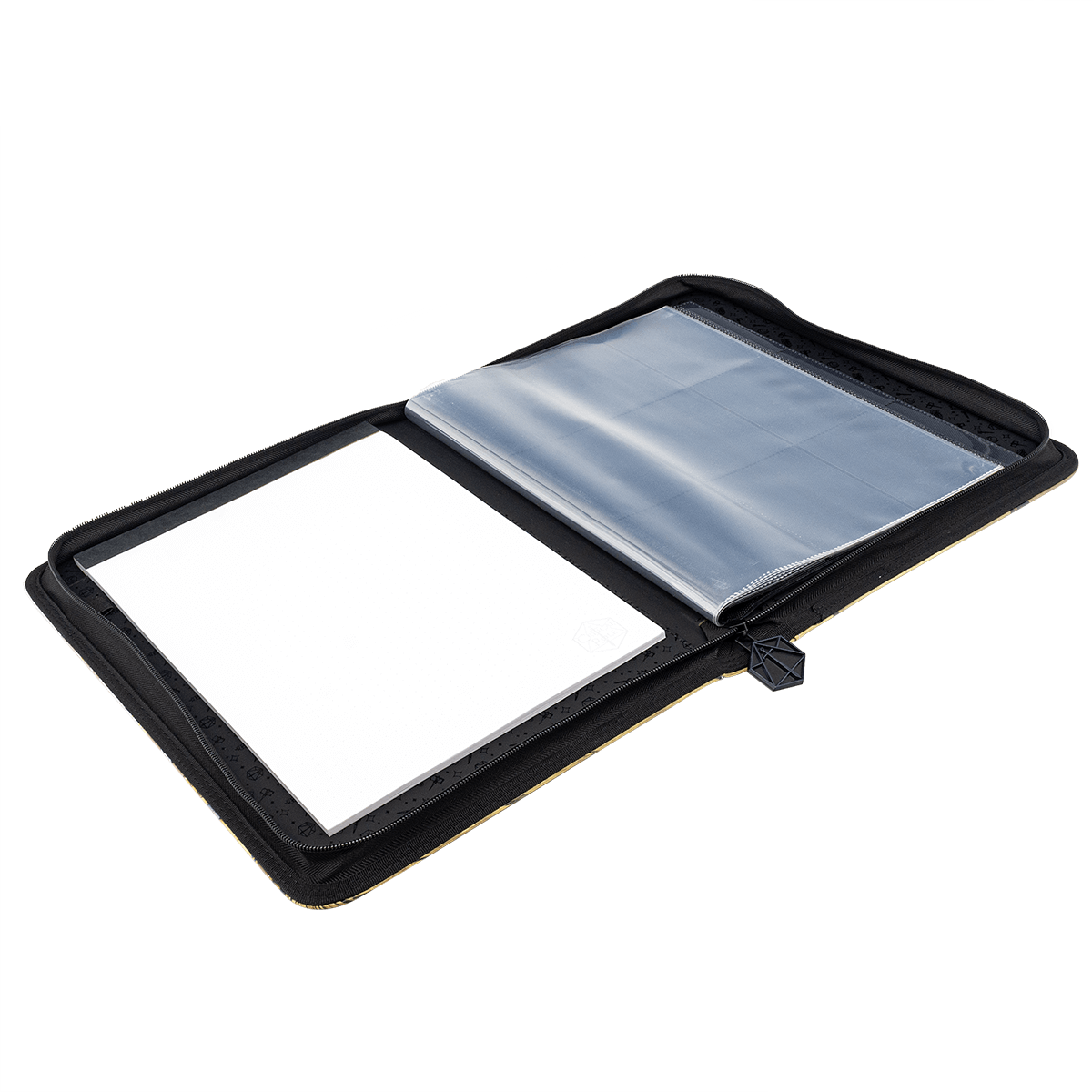 Prepare for adventure with the Printed Leatherette Book Folio featuring the Bells Hells Team Lineup from Critical Role! This is an updated version of the Premium Zippered Character Folio, redesigned to fit any TTRPG sourcebook, including the Tal'Dorei Campaign Setting Reborn book, and features exclusive artwork of the Bells Hells Team. Inside the premium canvas cover you’ll find a pocket to store notes or maps, 10 wet/dry-erase compatible pages for character sheets and notes, six 9-pocket pages for standard size spell cards 2.5" (6.3 cm) x 3.5" (8.8 cm), an elastic loop to store a pencil or marker, a Critical Role branded graph paper notepad, and the added pocket in the back to slide in the back cover of a sourcebook for easy access.