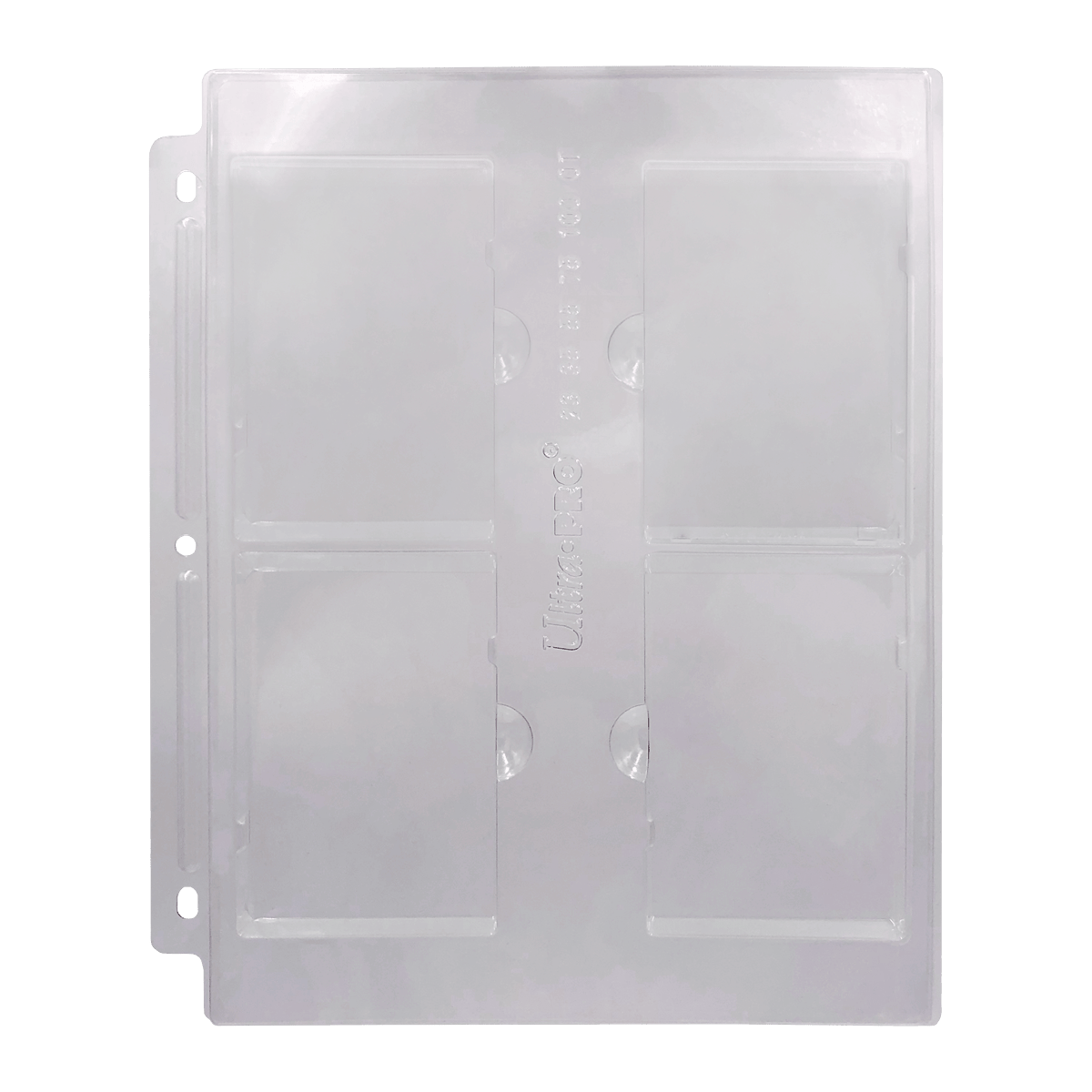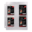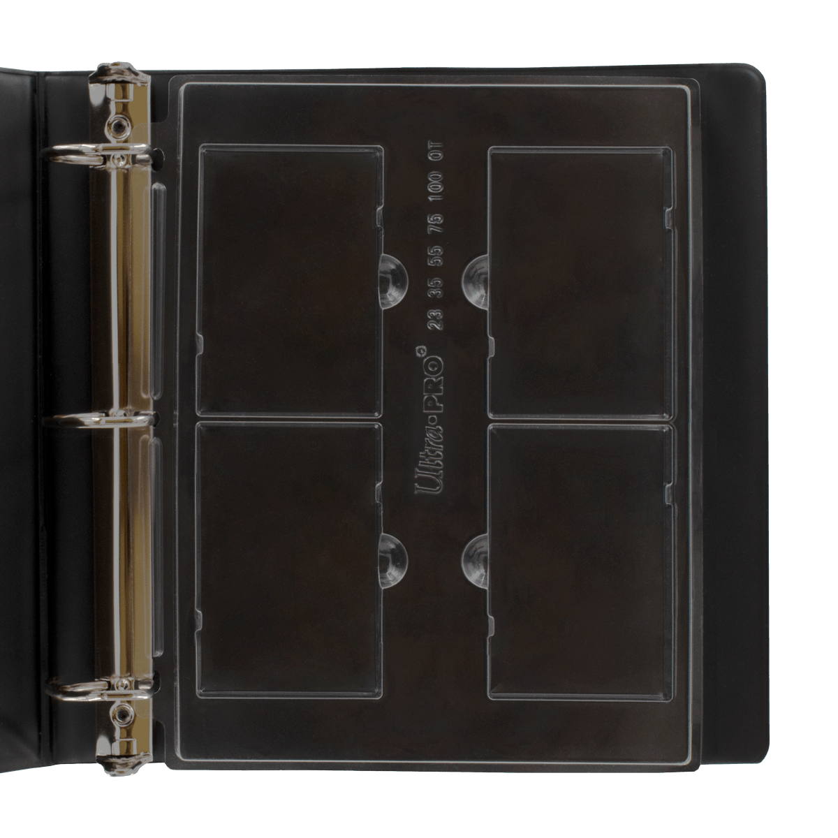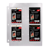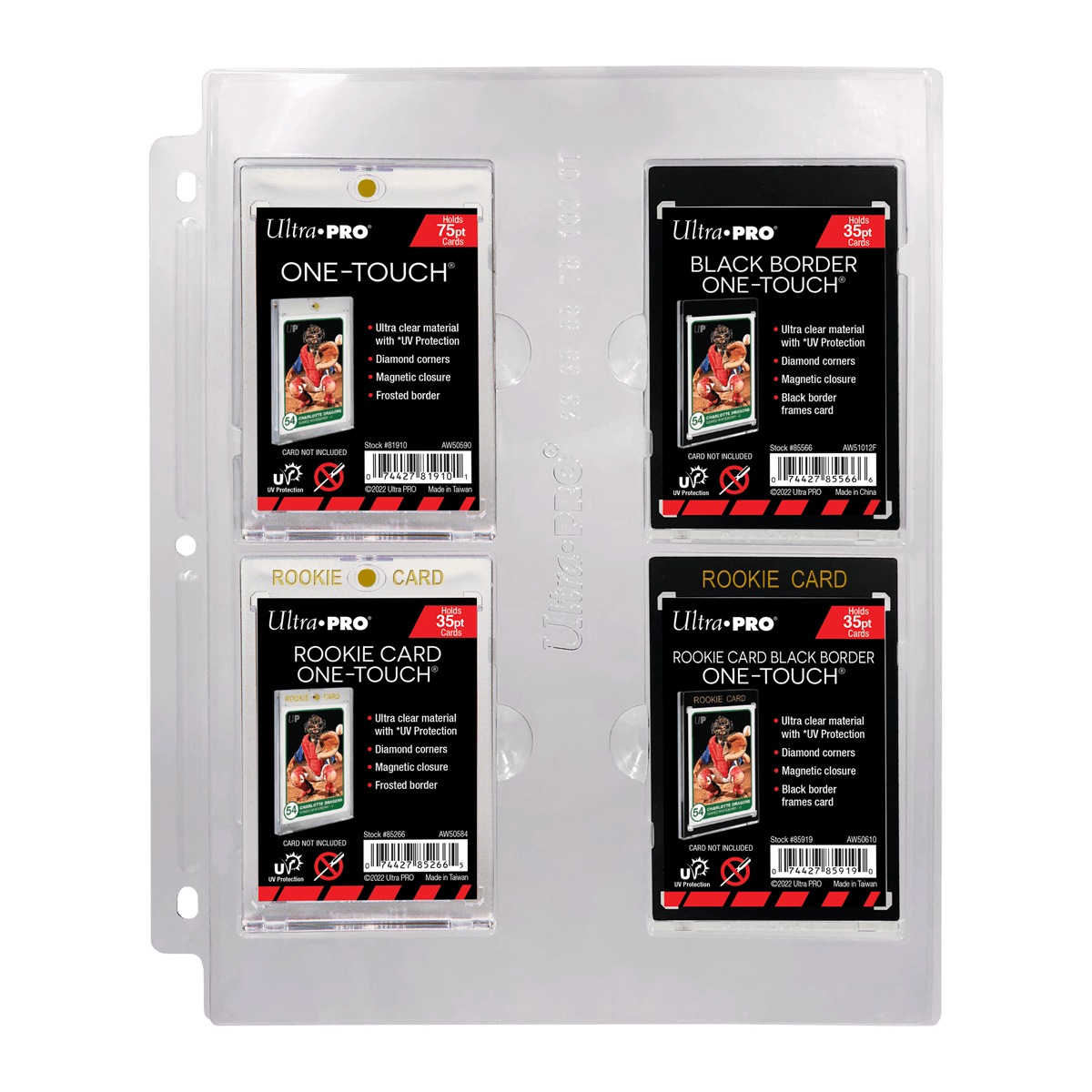 Why store your collectible cards in a box when you can easily flip through them in a binder? The ONE-TOUCH Display Page is the perfect way to store, organize and easily view your cards in an Ultra PRO 3-ring album. This page can hold cards in 23pt, 35pt, 55pt, 75pt, or 100pt ONE-TOUCH displays and is designed to hold 4 ONE-TOUCH displays in a rigid, 3-hole punched page. It features special lock-in tabs and finger notches to easily remove and reorganize slabs. These pages are a great way to show off your TCG and sportscard collection, or easily carry to conventions and signings.
