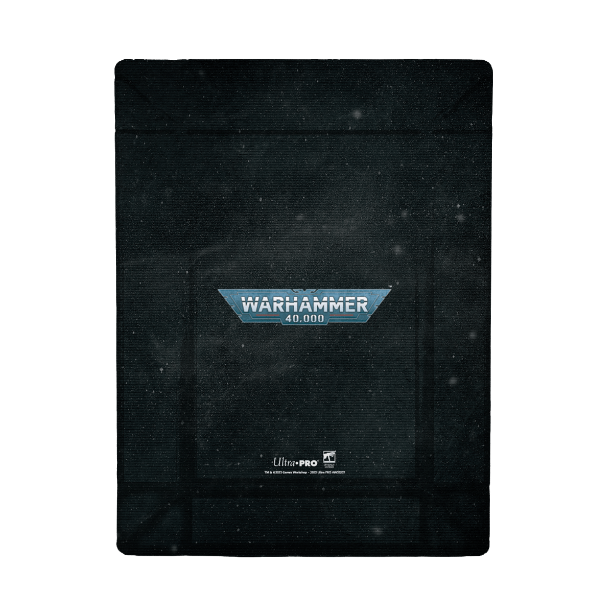 “In the grim darkness of the far future there is only war”, so prepare for battle with tabletop accessories for Warhammer 40,000! This Universal Folding Dice Tray offers a safe space for rolling your RPG dice when commanding your armies. Using the small magnets inside each corner, you can easily create an instant dice rolling area in seconds: simply pop up the side walls and you’re ready to roll! No bulky clasps or snaps needed. The reversible design features a printed leatherette with metal emblem accents on one side, and the iconic grimdark war quote on a pattern of spot UV faction symbols on the other. Sized no bigger than a sheet of paper (8.5 in. x 11 in.) when folded flat, you can easily take your dice rolling tray with you on the go inside your Datasheet Folio or Codex Book Folio.