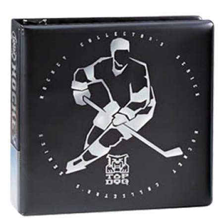 Álbum premium para páginas de tamaño estándar con lámina estampada en caliente con temática de hockey Top Dog sobre cubierta negra. Anilla en D reforzada de 2" con refuerzo para una carga rápida de las páginas. Los álbumes incluyen un rico acolchado de espuma. Fabricados con una ranura de indexación transparente en el lomo para facilitar la organización.