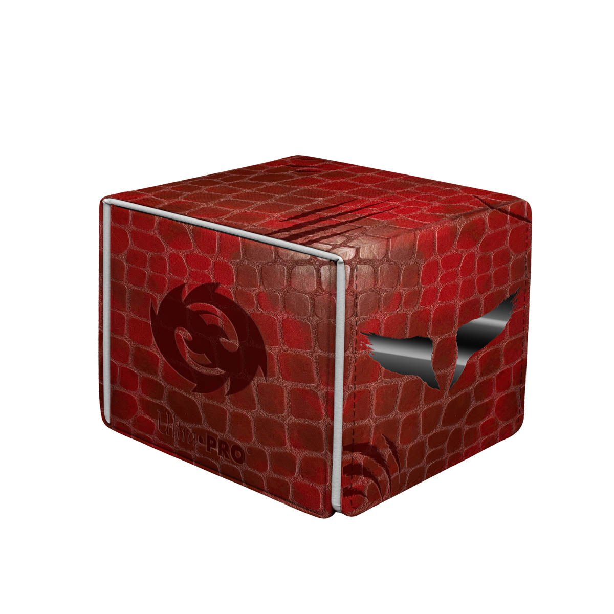 The Premium Alcove Edge Deck Box® for Magic: The Gathering features a premium red dragon scale textured leatherette finish with black spot foil accents. Every Alcove Edge includes a strong magnetic closure with a locking mechanism to keep your cards securely stored when not in use, as well as dual thumb notches for easy access to your deck. Store and protect up to 100 standard size trading cards double-sleeved in Ultra PRO Deck Protector® sleeves.