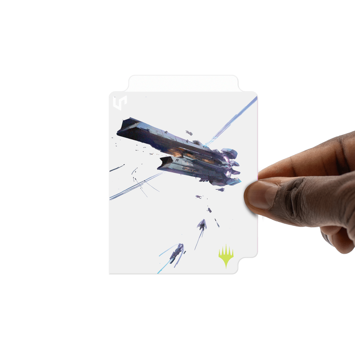 The 100ct Deck Protector Sleeves in Clear Box includes 100 Deck Protector sleeves, a transparent plastic 100+ Deck Box ®, and a deck divider, all featuring aligning artwork from Edge of Eternities. The sleeves are made using Ultra PRO's proprietary ChromaFusion technology to minimize delamination, and the 100+ Deck Box ® and divider are made from a clear rigid polypropylene material. All materials are non-PVC and archival-safe to provide premium protection.