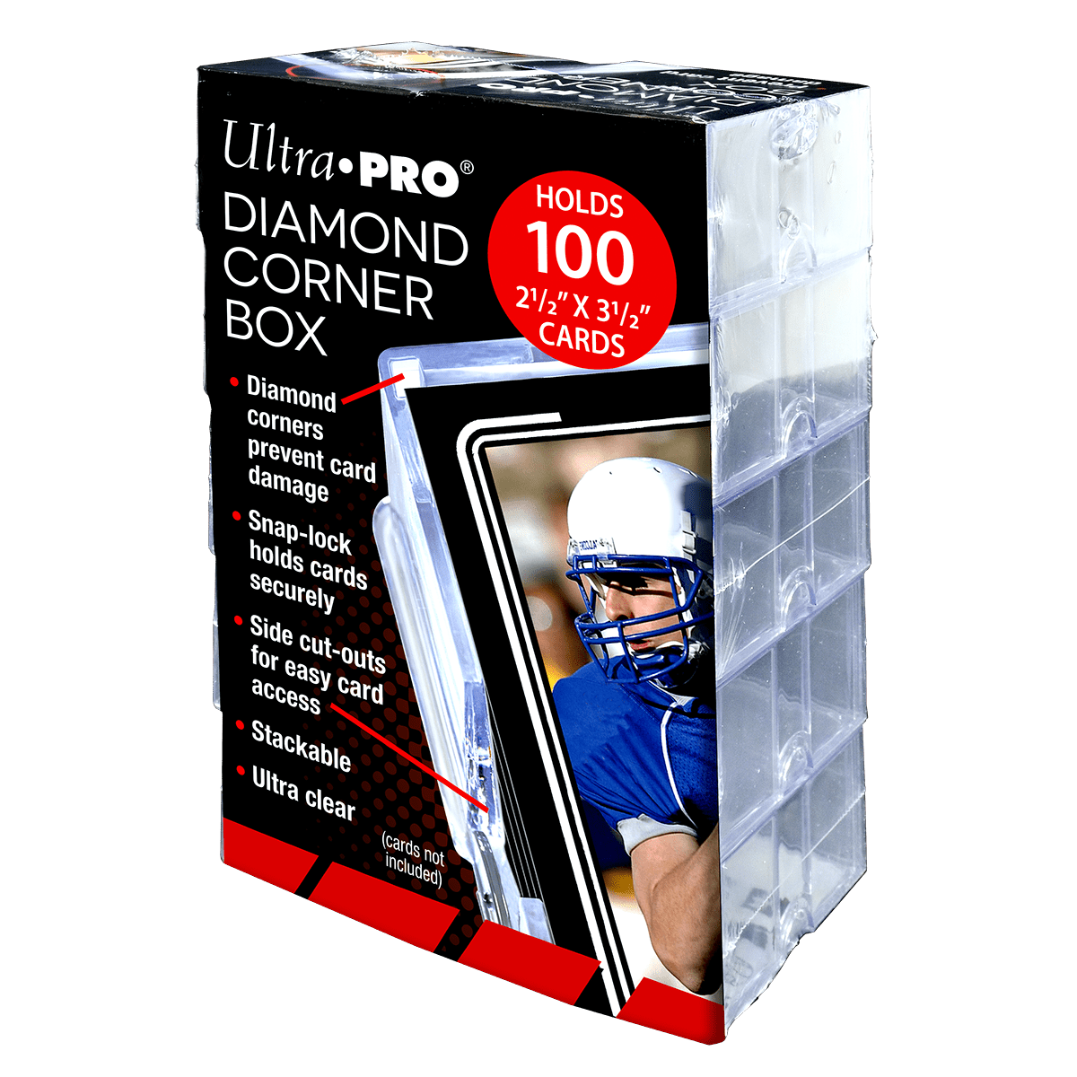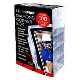 Protect your most valuable trading cards with a value pack of these highly durable, ultra-clear Diamond Corner Boxes by Ultra PRO. Each box holds up to 100 Standard size collectors cards and is constructed with the patented diamond corner design to prevent damage to card corners. The box utilizes snap-lock closures to keep the lid secure and finger slot side cut-outs for easy removal of contents. The boxes are also stackable, making them ideal for the organization and storage of your card collections. This value pack comes with ten (10) individual Diamond Corner Boxes.