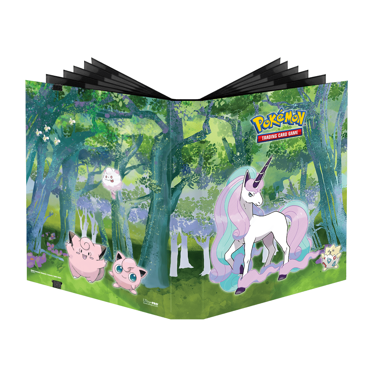 - Officially licensed PokemonTrading Card Game 9-Pocket PRO-Binder, featuring Galarian Rapidash, Jigglypuff, Clefairy, Swirlix, and Cutiefly