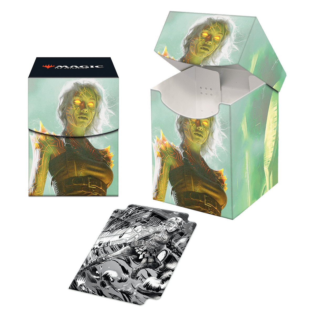 The 100+ Deck Box® card storage container features vibrant, full-color artwork from Magic: The Gathering and includes a deck divider. Made with archival-safe, non-PVC, rigid polypropylene materials, you can store up to 100 double-sleeved cards with confidence. The self-locking lid keeps your cards securely stored when not in use, while also offering easy access. Sized for standard size trading cards.